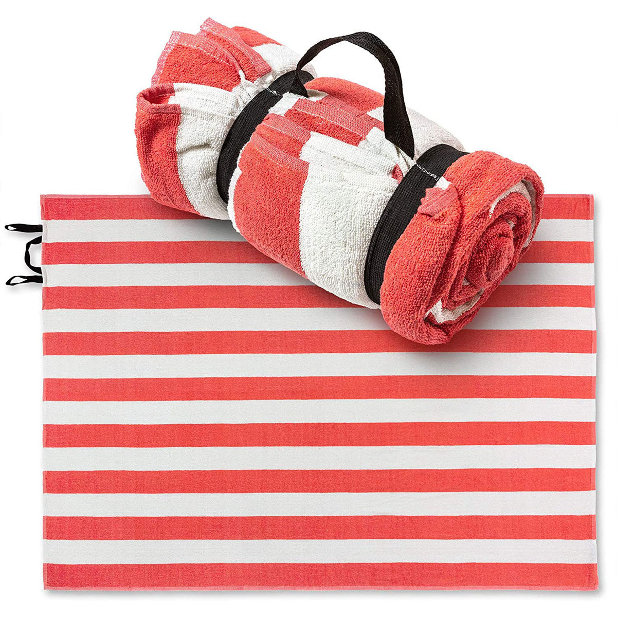 The towel features a terry loop on both sides and is made of absorbent loop terry cotton. This item is of Excellent quality. Great for the beach, camping, picnics, tailgating, pool, concerts, or any outdoor event.